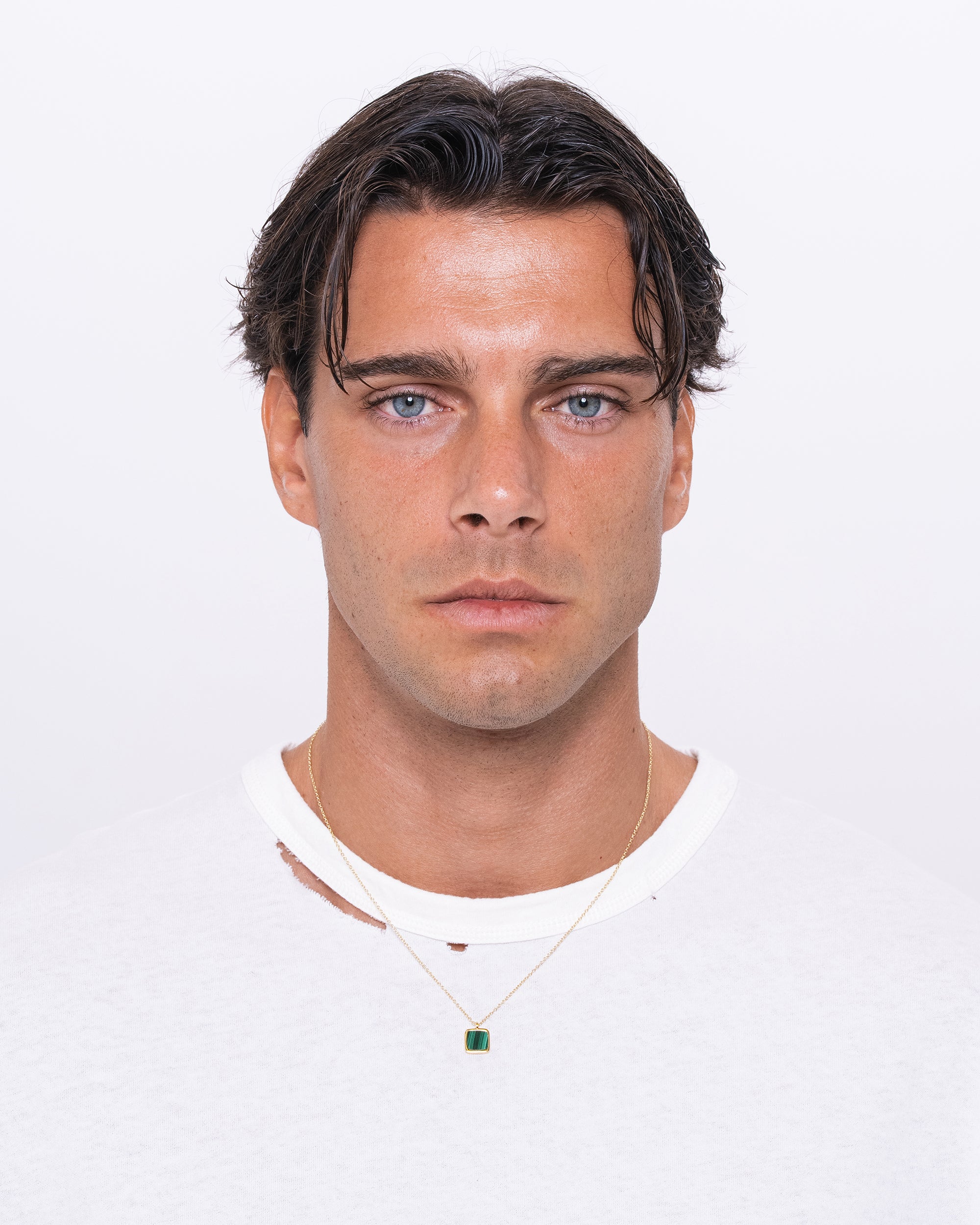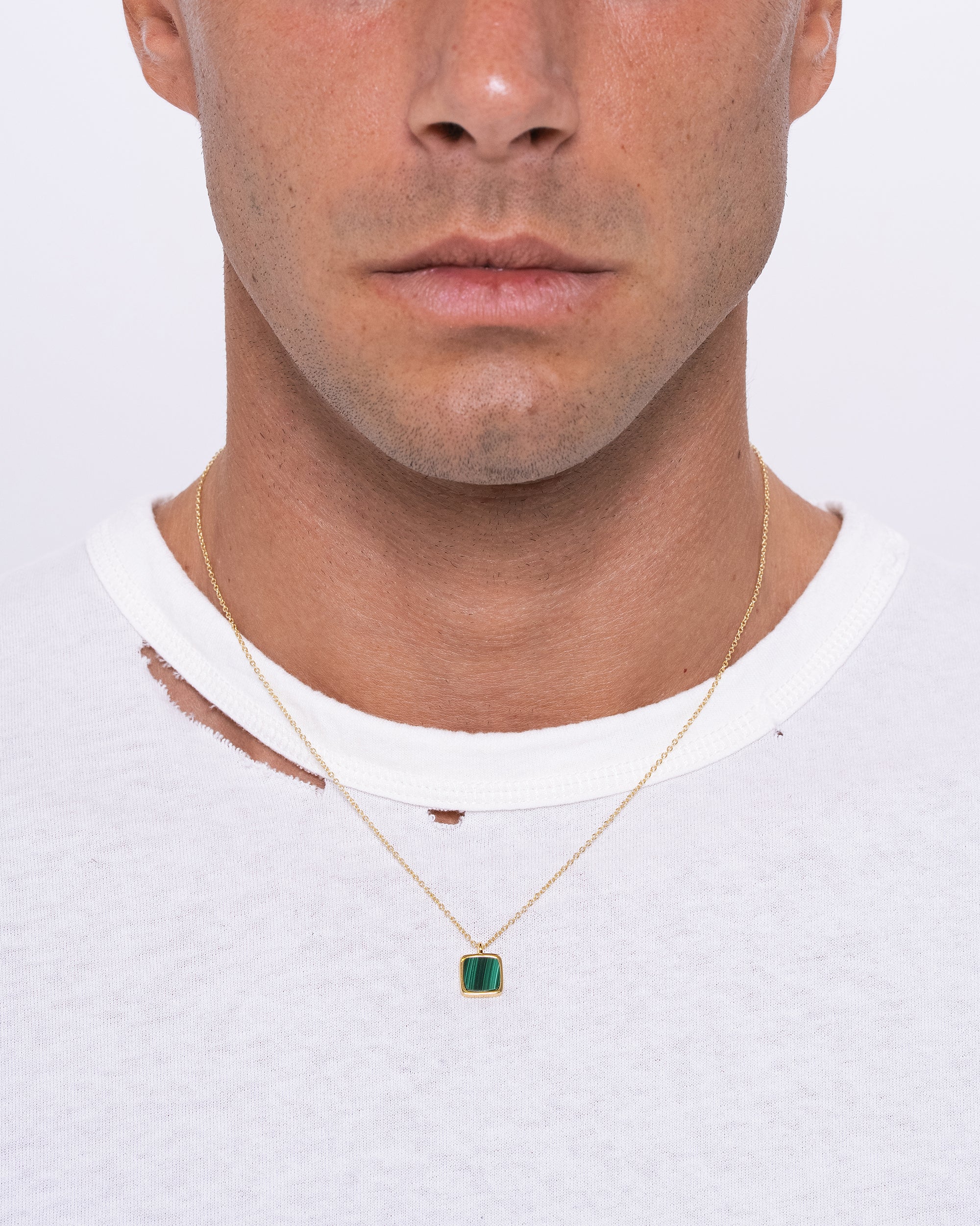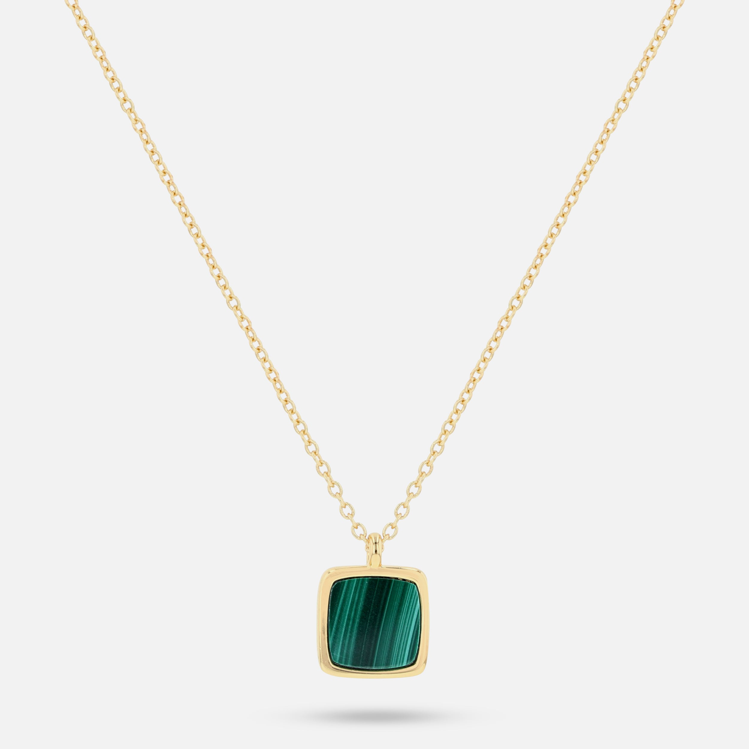 A classic low-profile pendant set with malachite stone. Clean, understated, and timeless. Worn as a symbol of balance, protection, and quiet confidence.