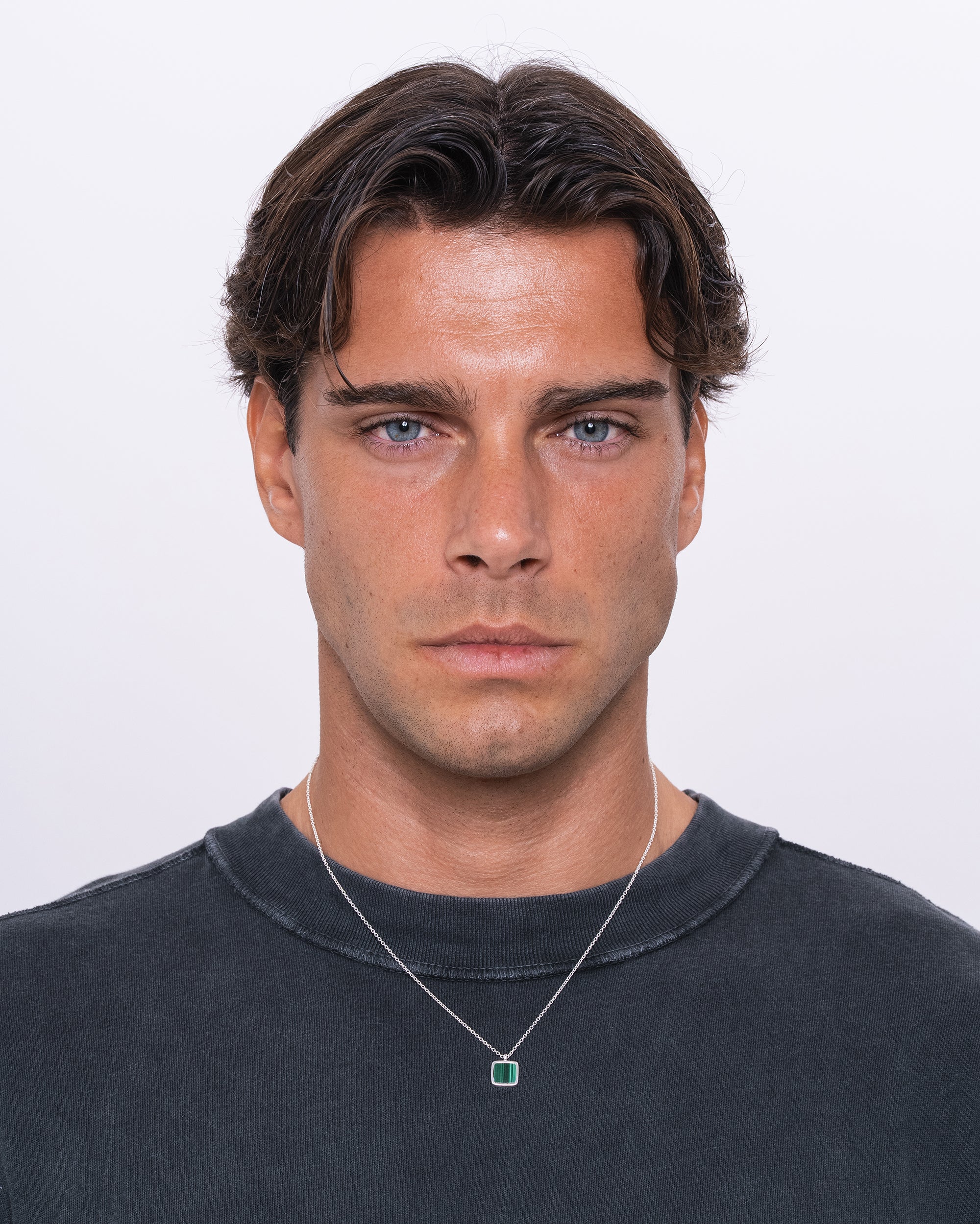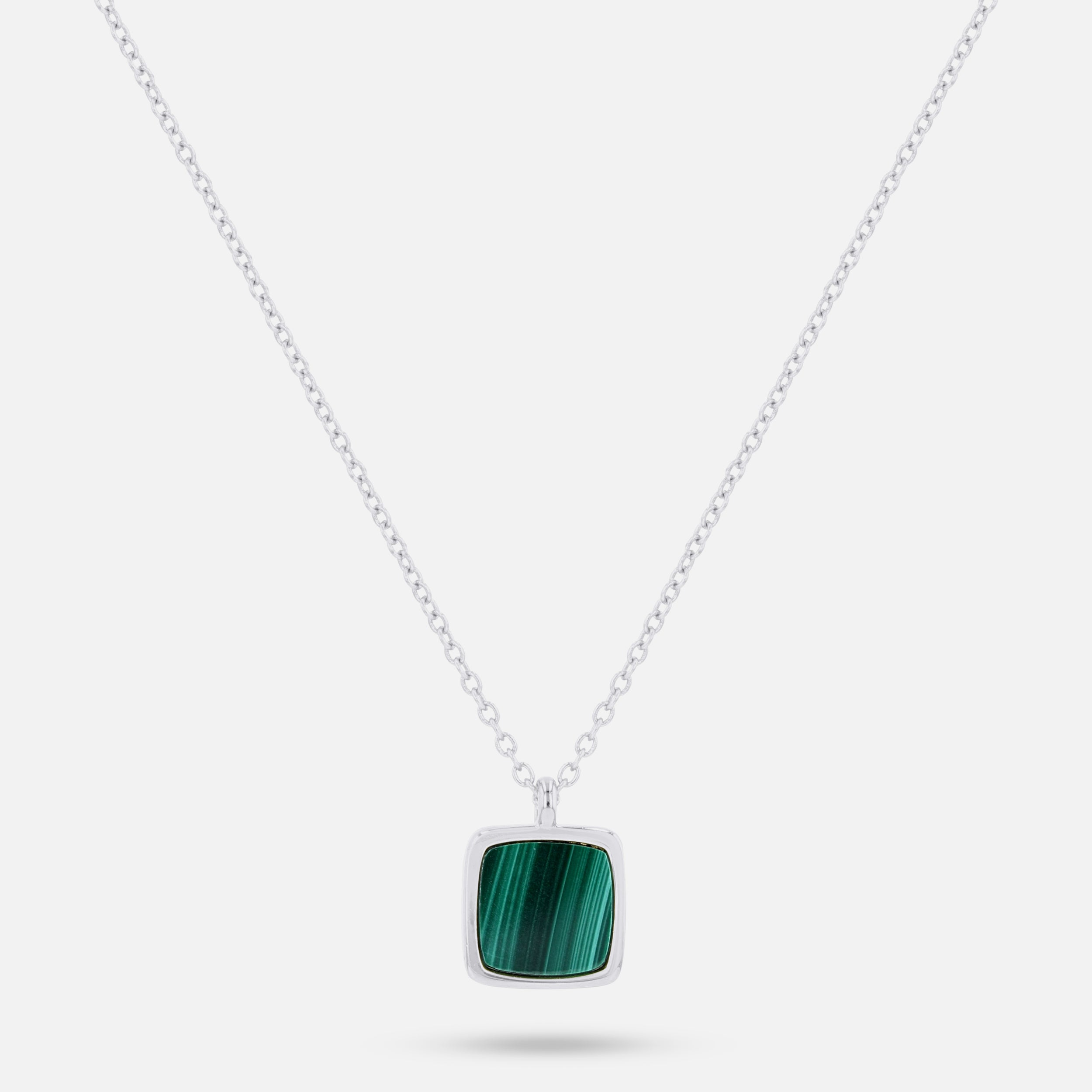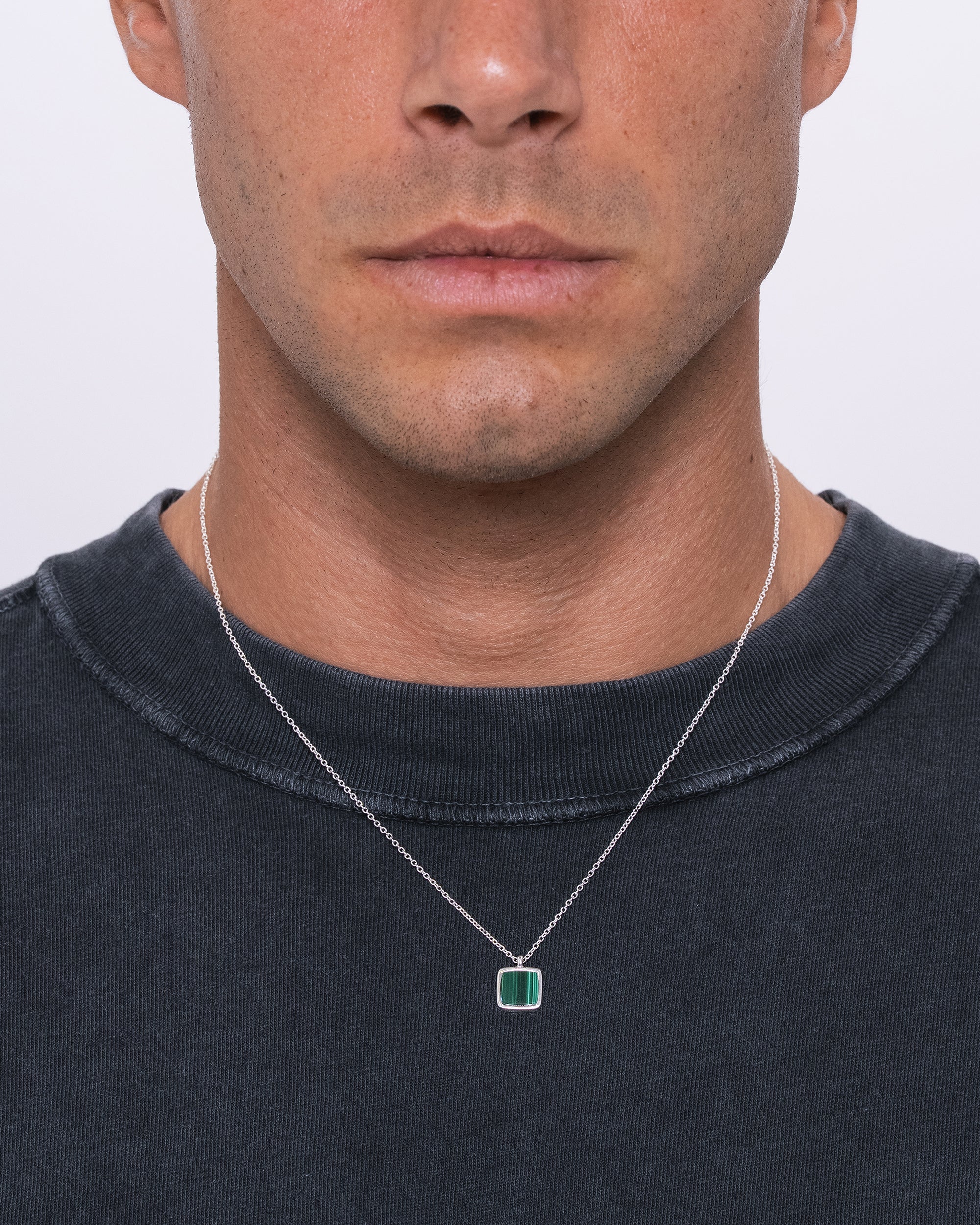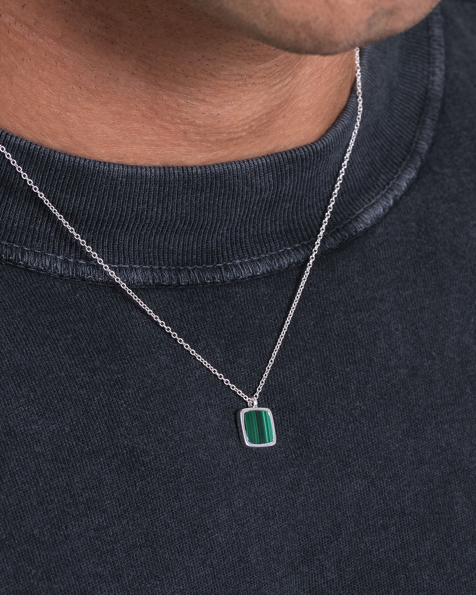 A classic low-profile pendant set with malachite stone. Clean, understated, and timeless. Worn as a symbol of balance, protection, and quiet confidence.