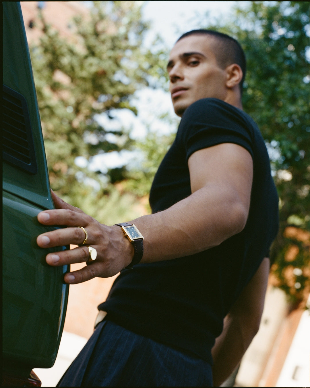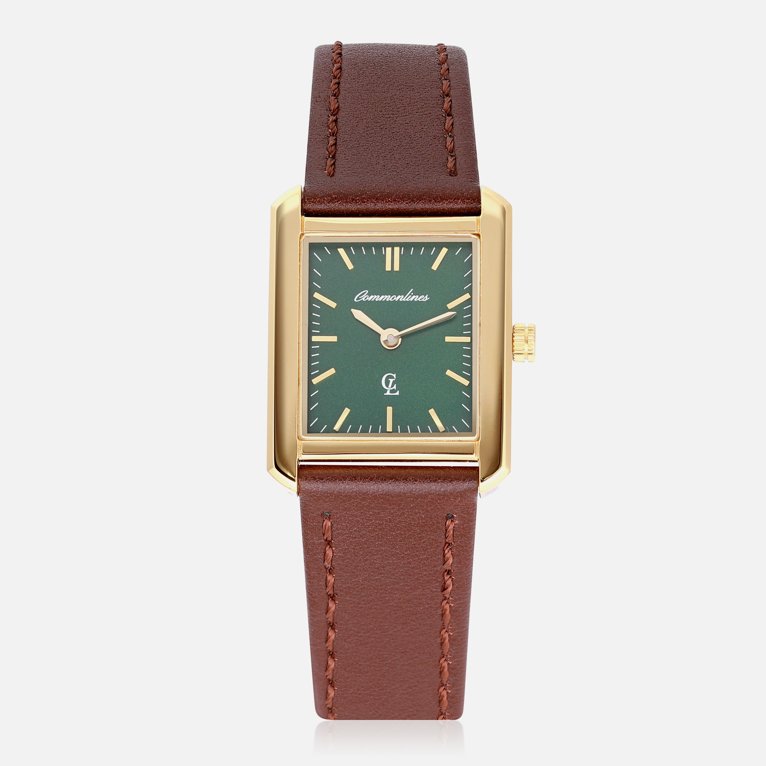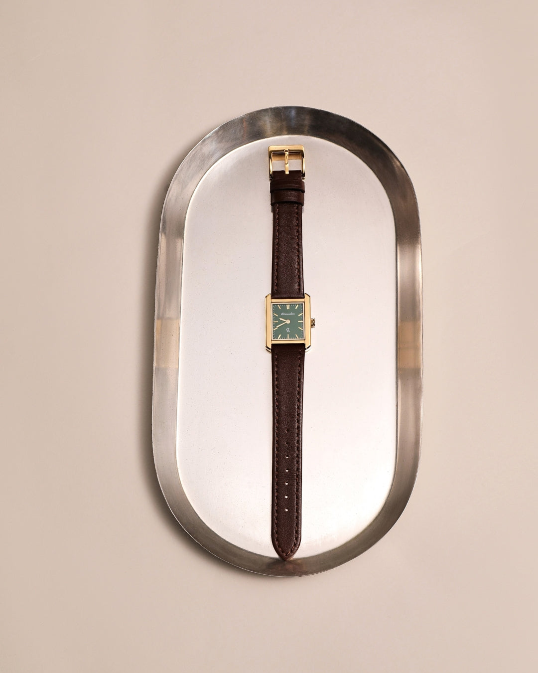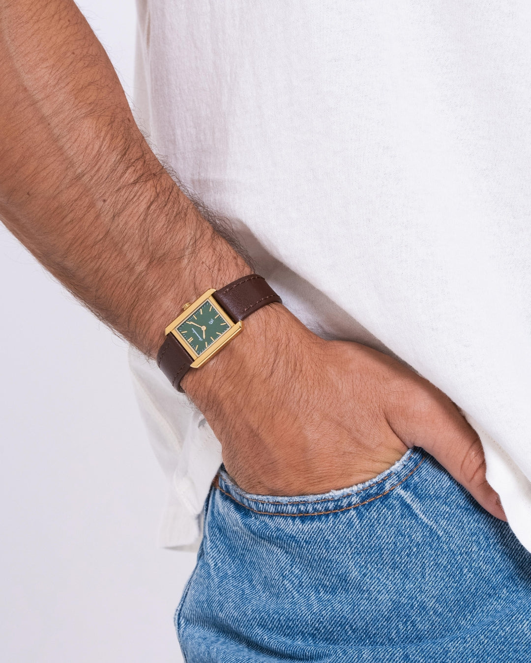 Vintage-inspired rectangular silhouette with deep forest green dial